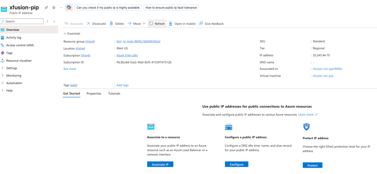 An existing VM named xfusion-vm-pip and a public IP address named xfusion-pip already exist.