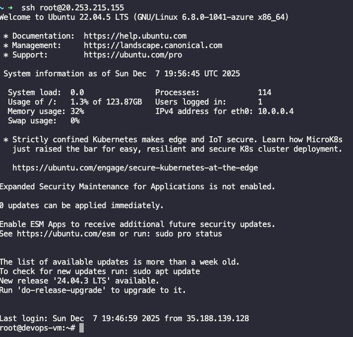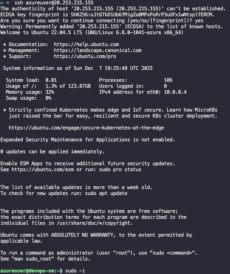 After adding the public key, make sure that you are able to SSH into the devops-vm VM as the root user from the Azure client host without needing a password.
