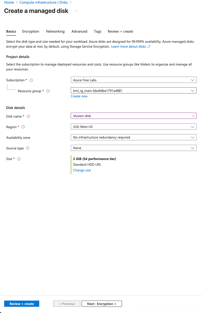 Choose the existing resource group and give the disk name as xfusion-disk.