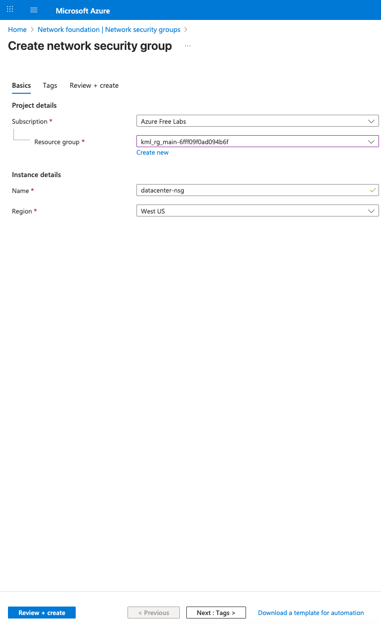 Choose the existing resource group and name as datacenter-nsg.