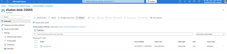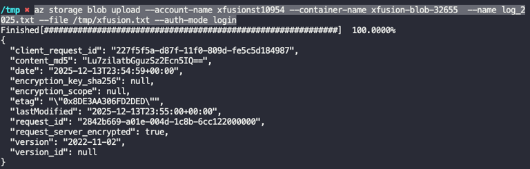 az storage blob upload \ --account-name datacenterst1021 \ --container-name datacenter-blob-17986 \ --name datacenter.txt \ --file /tmp/datacenter.txt \ --auth-mode login
