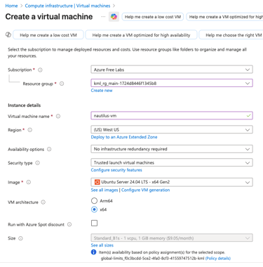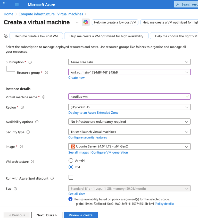 For create a virtual machine, choose the existing resource group and give the vm name as datacenter-vm as provided in the lab. Choose the Image as Ubuntu Server 24.04 LTS. Choose the size as Standard B1s.