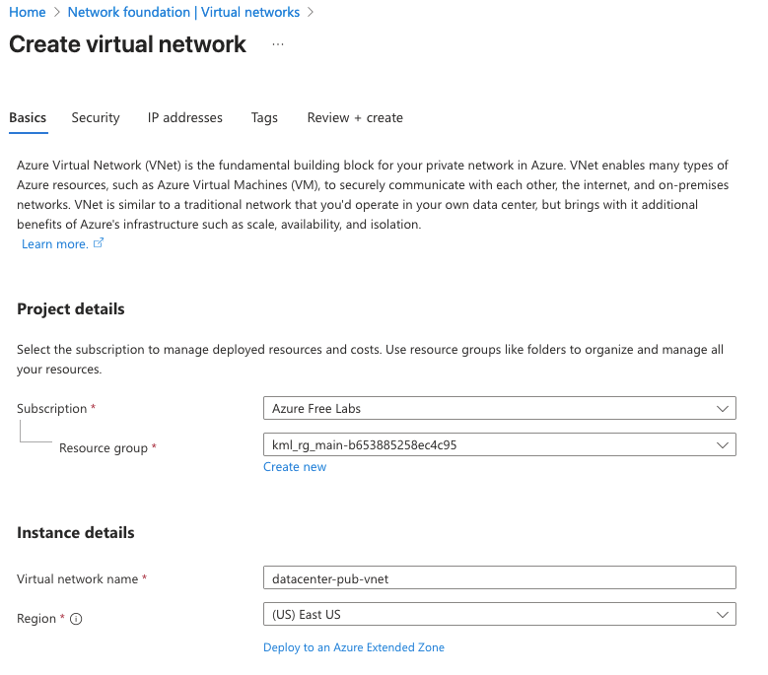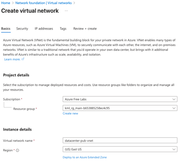 Create a Virtual Network called datacenter-pub-vnet.