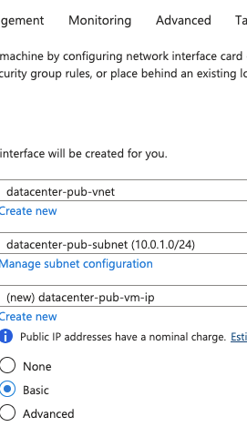 In Networking, choose the newly created Virtual Network as datacetner-pub-vnet.