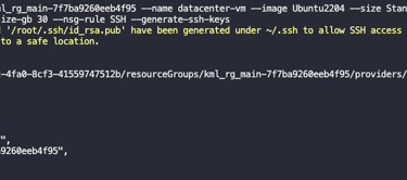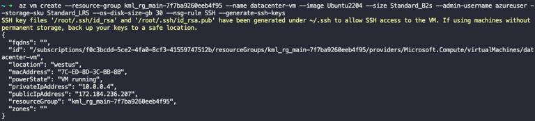 az vm create --resource-group kml_rg_main-7f7ba9260eeb4f95 --name datacenter-vm --image Ubuntu2204 --size Standard_B2s --admin-username azureuser --storage-sku Standard_LRS --os-disk-size-gb 30 --nsg-rule SSH --generate-ssh-keys